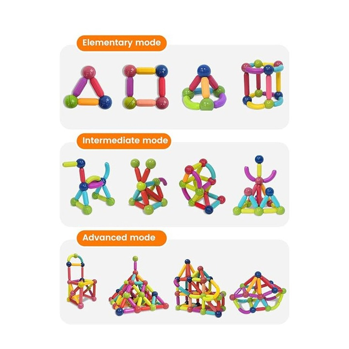 Setul de joaca magnetic poate fi folosit pentru zeci de constructii creative, ajutand la imbunatatirea abilitatilor copiilor in domeniile stiinta, tehnologie, inginerie si matematica. Este o jucarie minunata, prin intermediul careia cei mici isi dezvolta capacitatea de coordonare mana-ochi si abilitatile motorii fine, isi antreneaza rabdarea, curiozitatea si imaginatia.